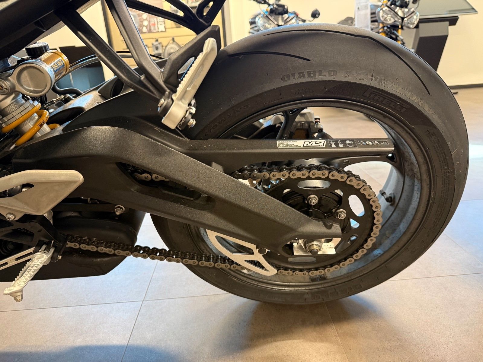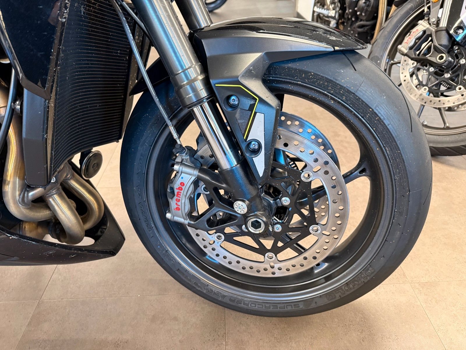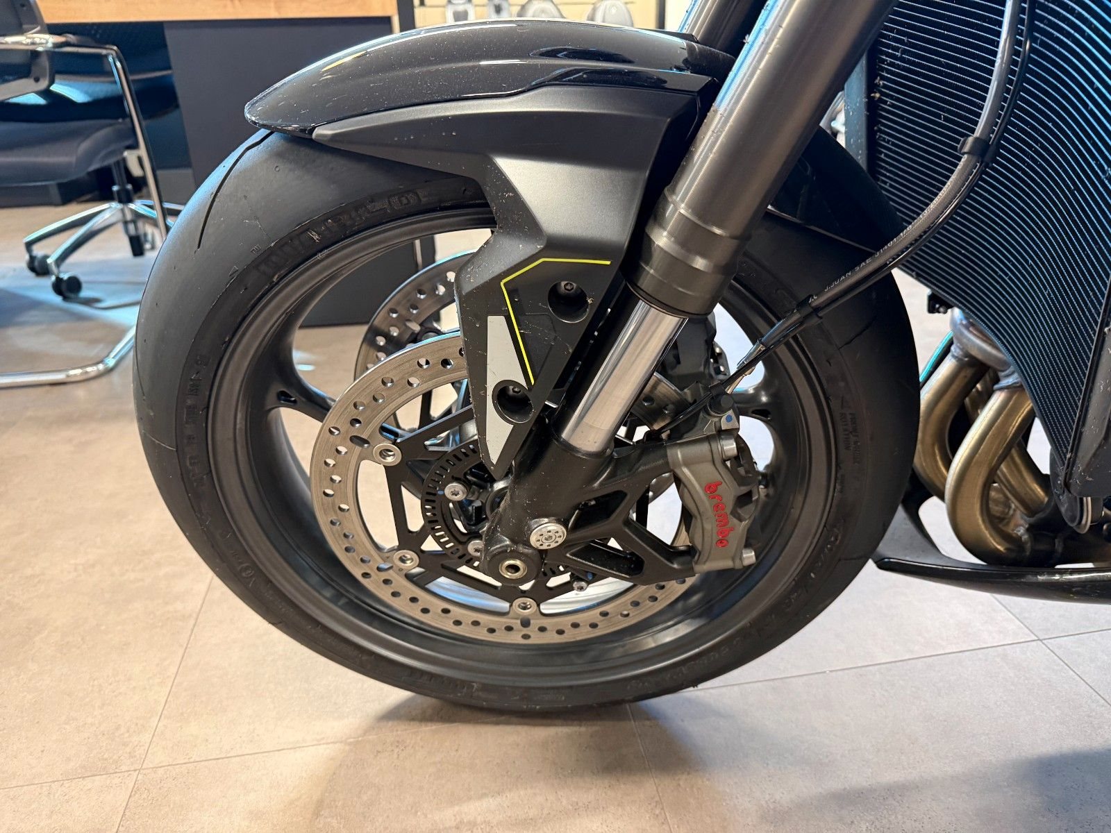 - Zwei schwimmend gelagerte 310-mm-Bremsscheiben vorne, Brembo Stylema 4-Kolben-Radial-Monobloc-Bremssättel, Kurven-ABS, Brembo MCS Radial-Hauptzylinder