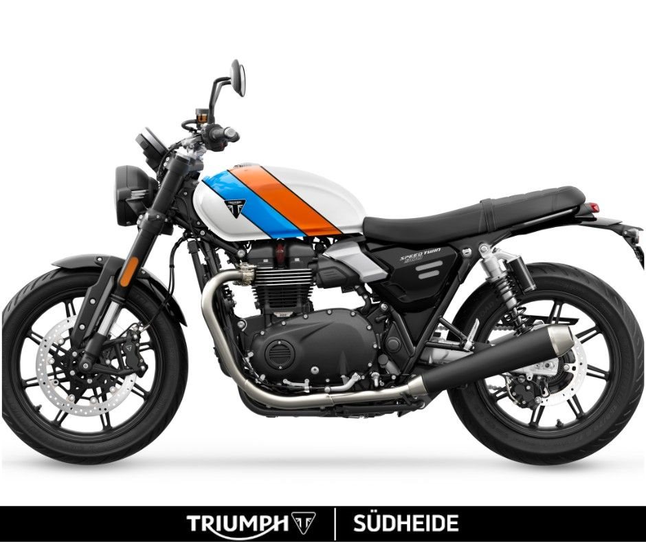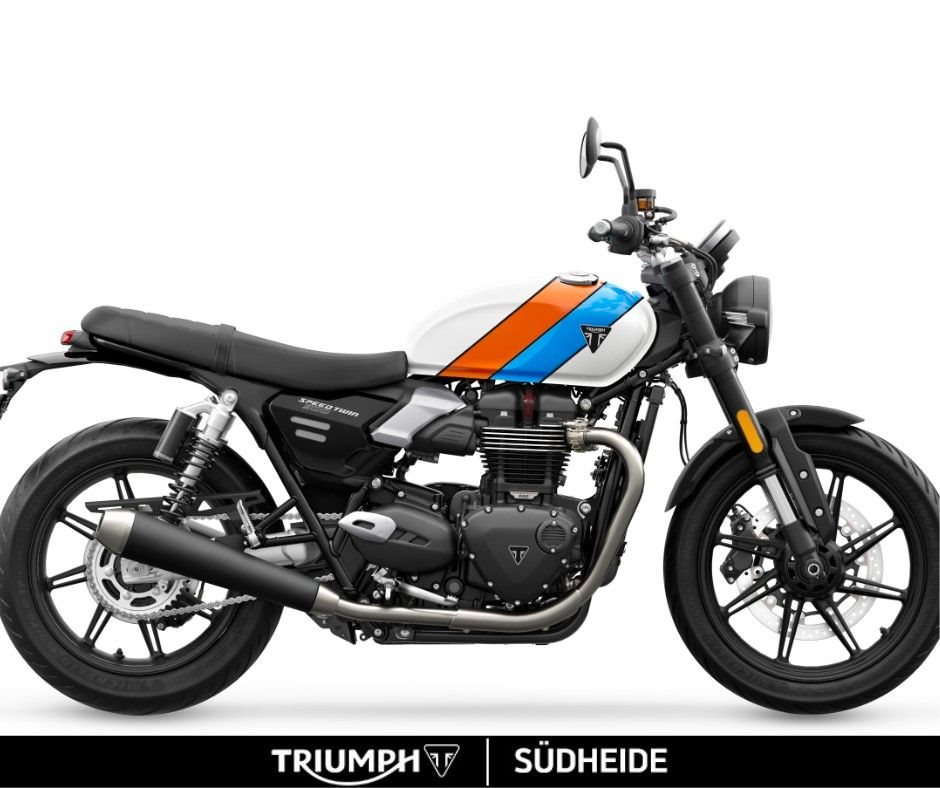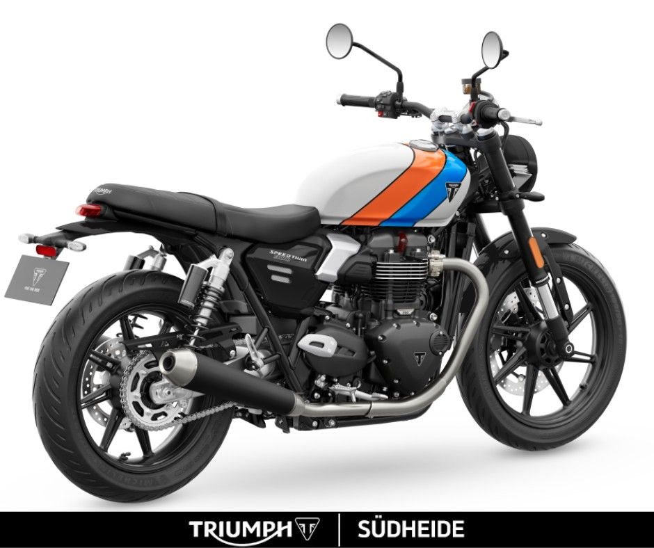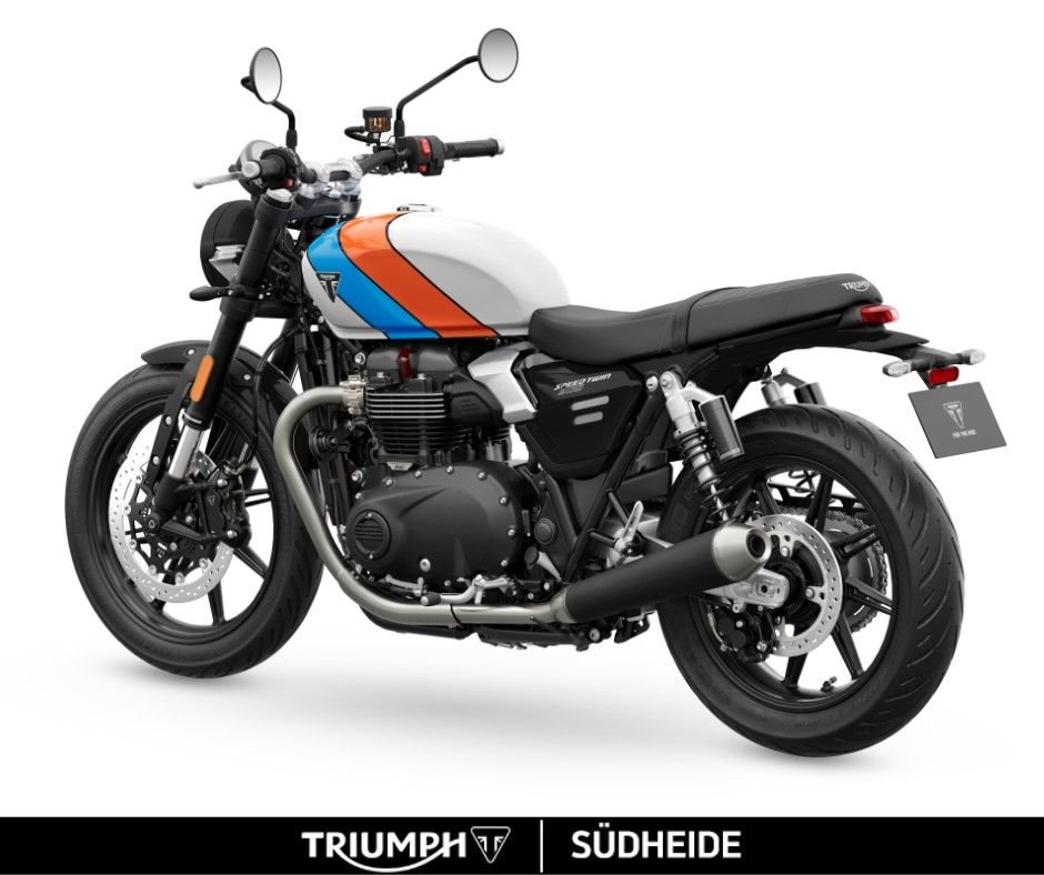 - Schwimmend gelagerte 320 mm Bremsscheibe vorne, 4-Kolben-Radialsättel mit Triumph-Logo