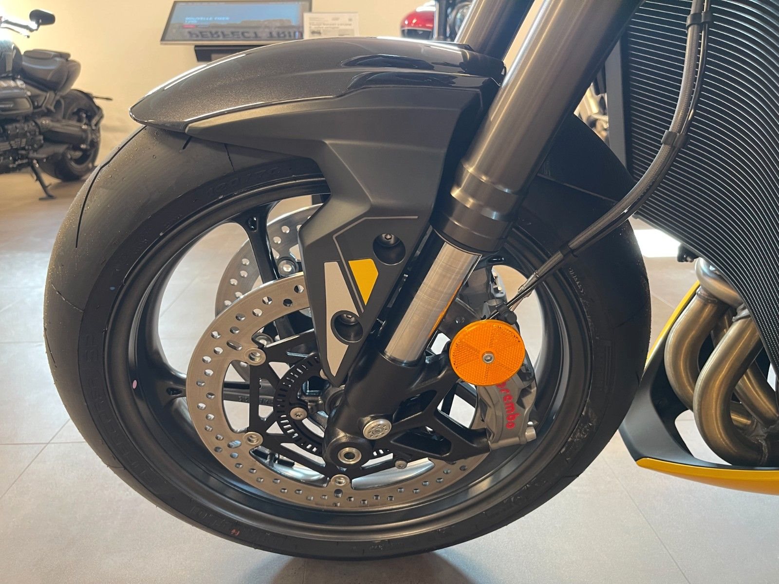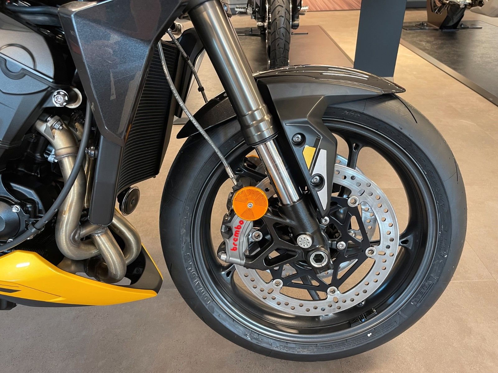- Zwei schwimmend gelagerte 310-mm-Bremsscheiben vorne, Brembo Stylema 4-Kolben-Radial-Monobloc-Bremssättel, Kurven-ABS, Brembo MCS Radial-Hauptzylinder